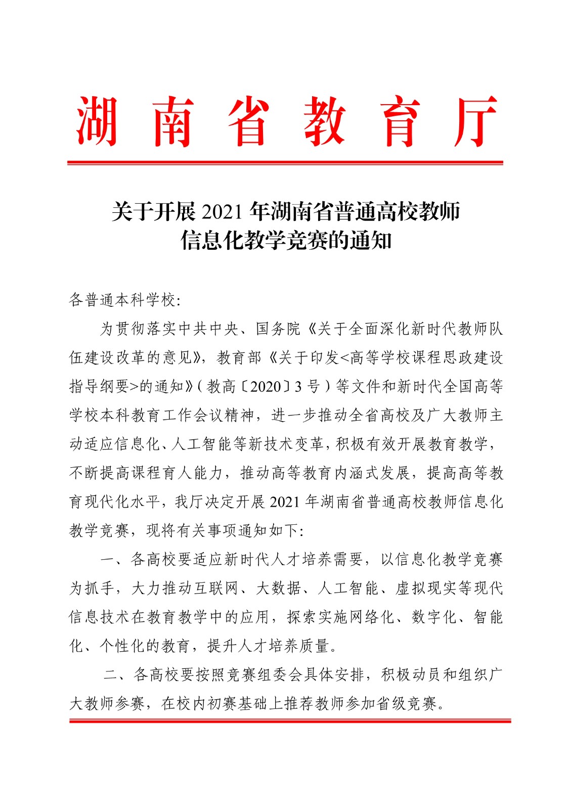 关于开展2021年湖南省普通高校教师信息化教学竞赛的通知